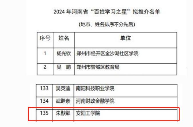 近日,河南省教育厅办公室《关于2024年河南省“百姓学习之星”“终身学习品牌项目”拟推介名单的公示》,公司退休职工朱猷卿同志被推介为2024年度河南省“百姓学习之星”。